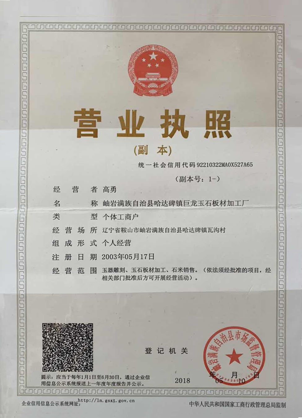 本廠建立于一九九三年,在總經理高勇先生的決策管理下,以“質量求生存,靠信譽求發展”的經營理念,使企業取得了輝煌的成果,目前是岫巖滿族自治縣較大的玉石板材公司。